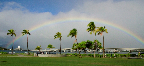 Cơn mưa nhẹ trong ánh bình minh tạo nên một vầng cầu vồng ngoạn mục để đón chúng tôi tại Trân Châu cảng, một hình ảnh rất đặc trưng của bang Hawaii. Chiếc tàu USSArizona nằm vĩnh viễn dưới đáy nước, những chiến hạm lừng lững bao quanh khu vực cùng những quả thủy lôi ghê gớm được trưng bày dọc lối đi nhưng vẫn cảm giác rất hòa bình. Nhìn chứng tích chiến tranh để không bao giờ muốn nó xảy ra lần nữa, nhìn bảng chữ tên tưởng niệm những người ngã xuống dài bất tận như câu hỏi và thách thức với người sống về trách nhiệm với hòa bình.
